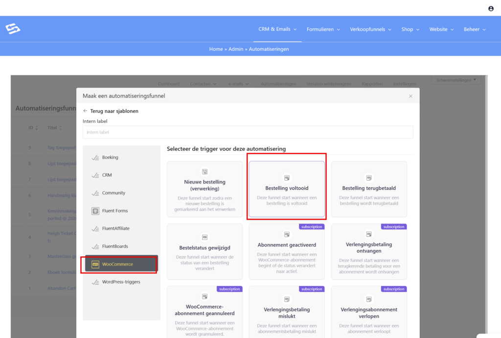 Kies als startstap WooCommerce → Bestelling voltooid.