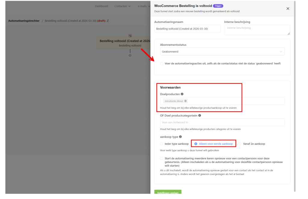 Zet deze optie aan. Hierdoor start de automation alleen wanneer iemand voor het eerst een bestelling plaatst in je webshop.