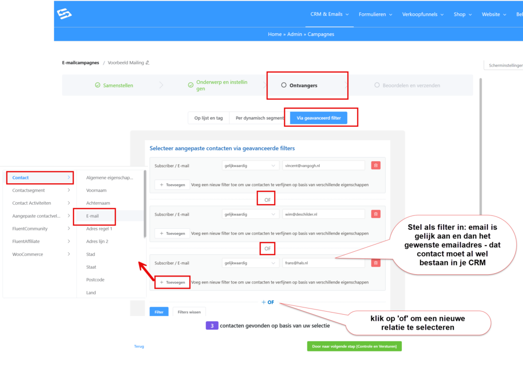 Dan wordt dat adres niet meegenomen in de campagne. Het filter toont alleen bestaande contacten uit je CRM.