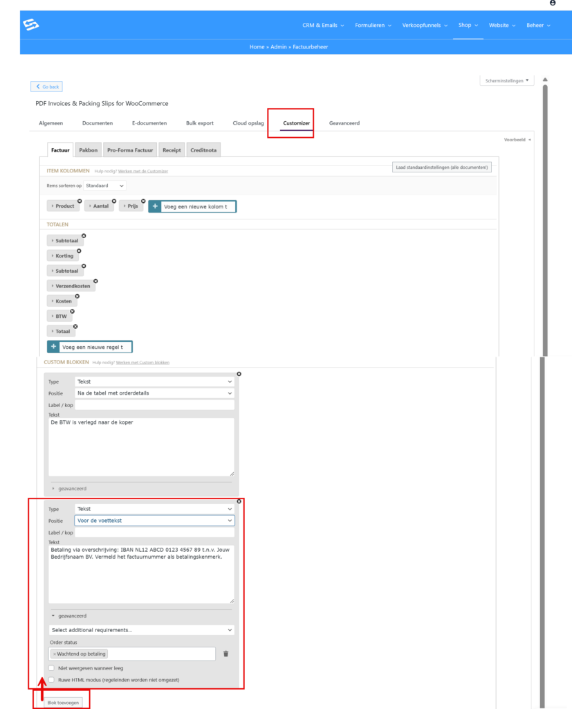 Ga naar Shop → Factuurbeheer en open het tabblad ‘Customizer’.
