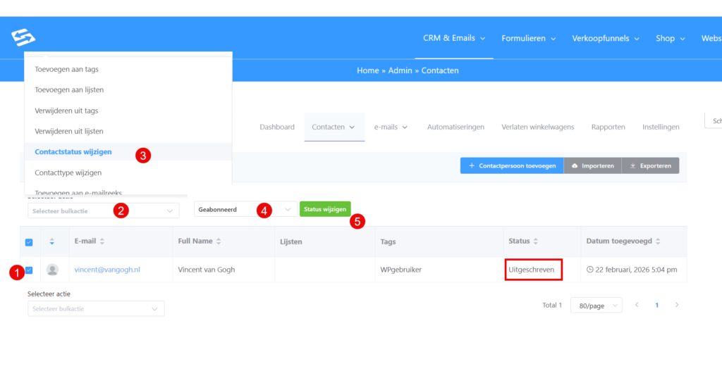 Selecteer ‘Status wijzigen’ en kies de nieuwe status. Dit is vooral nuttig voor het opschonen van je lijst, bijvoorbeeld het markeren van oude inactieve contacten als uitgeschreven of het corrigeren van incorrecte statussen na een import.