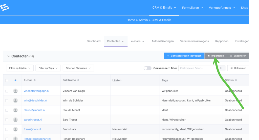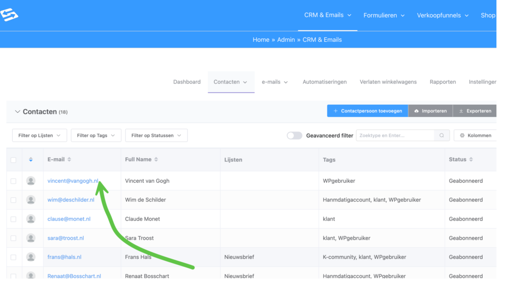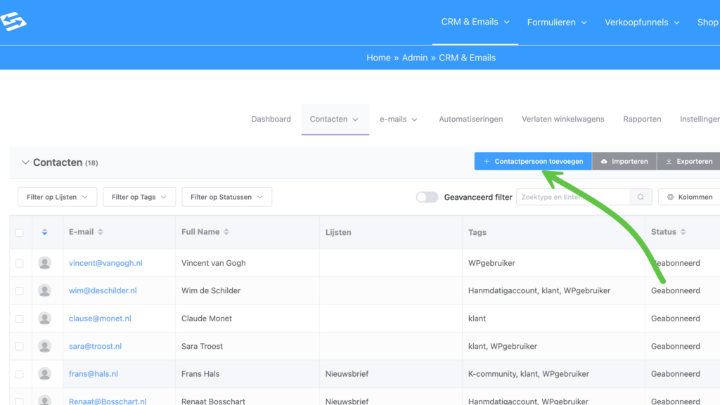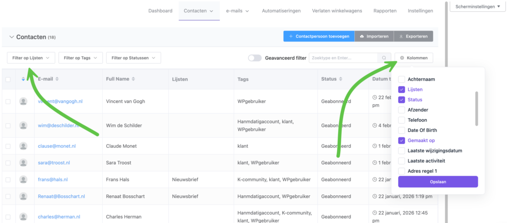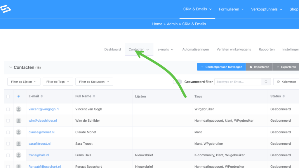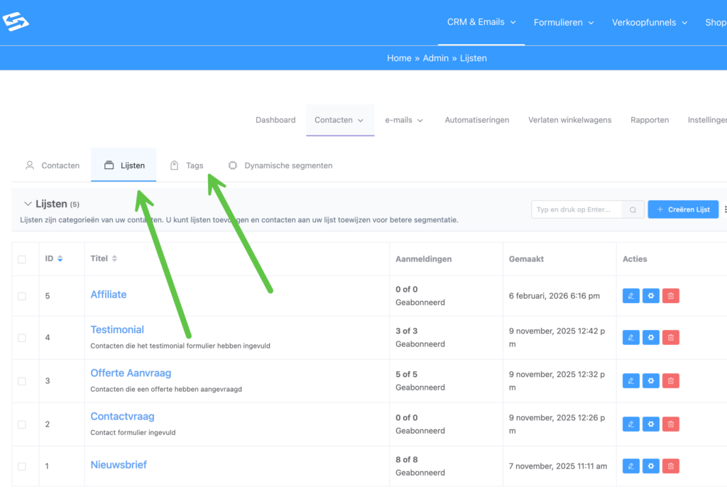 Lijsten en tags zijn je belangrijkste tools voor het organiseren van contacten. Ga naar CRM & Emails → Contacten → Lijsten of Tags