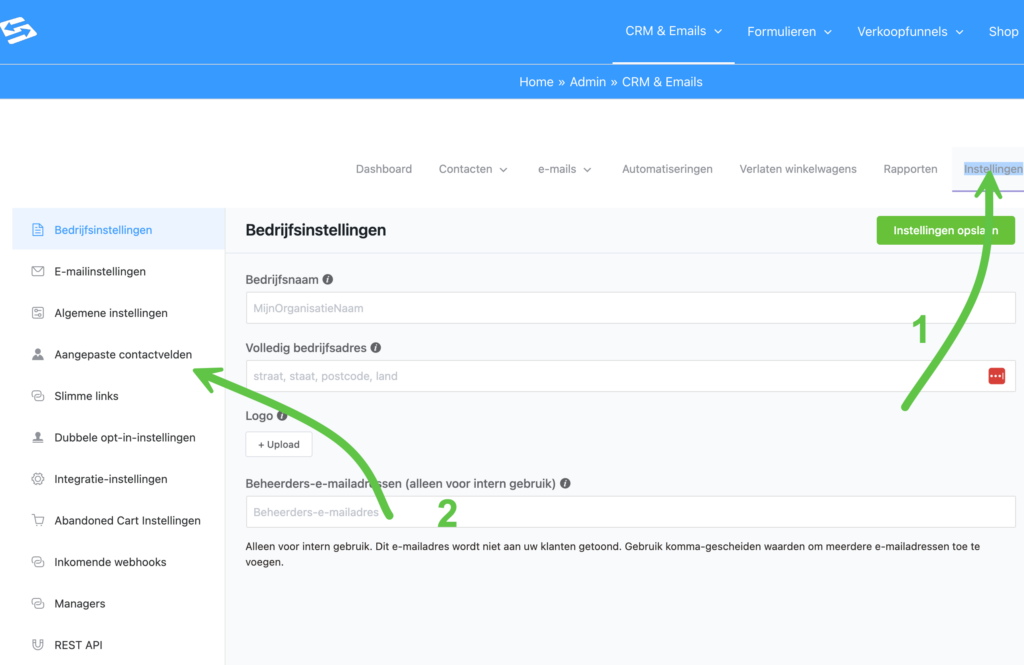 Ga naar CRM & Emails → CRM Instellingen → Aangepaste velden om deze velden aan te maken. Eenmaal aangemaakt kun je ze invullen bij elke relatie en gebruiken voor gerichte e-mailcampagnes.