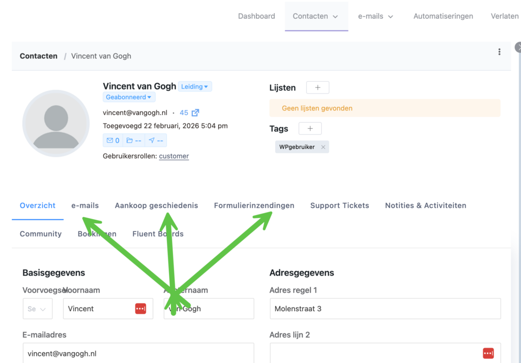 Vanuit dit scherm kun je alle gegevens bijwerken, de relatie toevoegen aan andere lijsten, tags toekennen of notities maken voor intern gebruik.