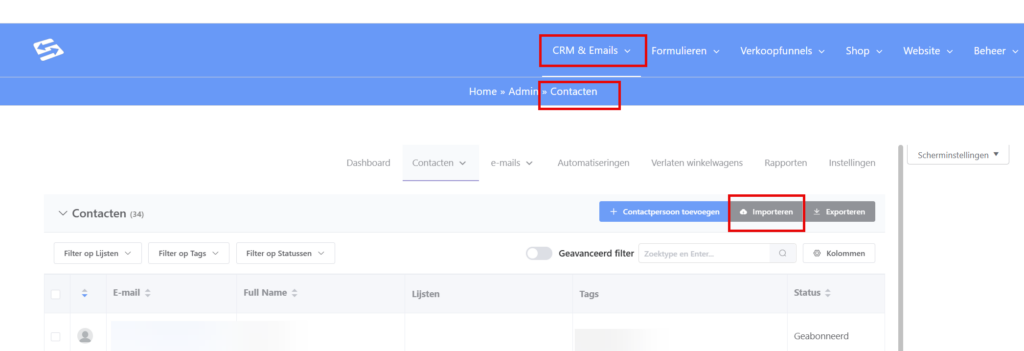 Ga in je Autorespond administratie naar CRM & Emails → Contacten. Klik rechtsboven op de knop “Importeren” om het import-proces te starten.