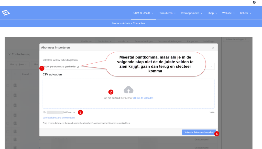 Zorg ervoor dat de eerste rij van je bestand de kolomnamen bevat. Gebruik duidelijke namen zoals “voornaam”, “achternaam”, “email”, “bedrijf” of “telefoon”. Verwijder lege rijen en controleer of e-mailadressen correct geformatteerd zijn. Contacten zonder geldig e-mailadres kunnen niet geïmporteerd worden omdat e-mail het primaire identificatieveld is.