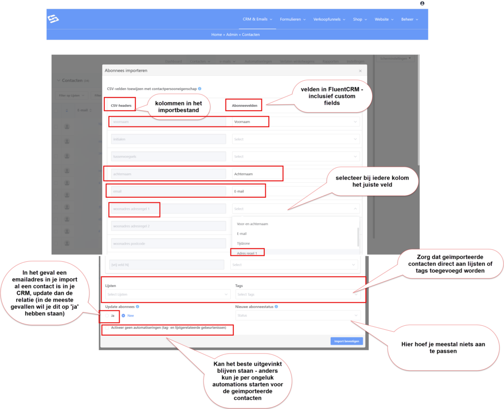 - Velden matchen: In de volgende stap kun je aangeven welke kolommen uit je bestand overeenkomen met welke velden in het CRM. Het systeem probeert automatisch te herkennen welke kolom wat is, maar controleer dit altijd handmatig. Je kunt velden matchen met standaard contactvelden zoals naam en e-mail, maar ook met aangepaste velden die je eerder hebt aangemaakt.