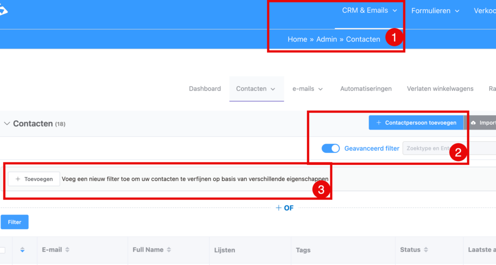 De krachtigste manier om contacten te segmenteren is via de geavanceerde filter in je contactenoverzicht. Ga naar CRM & Emails → Contacten en zet rechtsboven de vink aan bij ‘Geavanceerd filter’. Klik dan op Toevoegen.