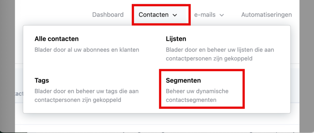 Je kunt dynamische segmenten vinden en beheren via CRM & Emails → Hooveren met je muis boven Contacten → ‘Segmenten’.