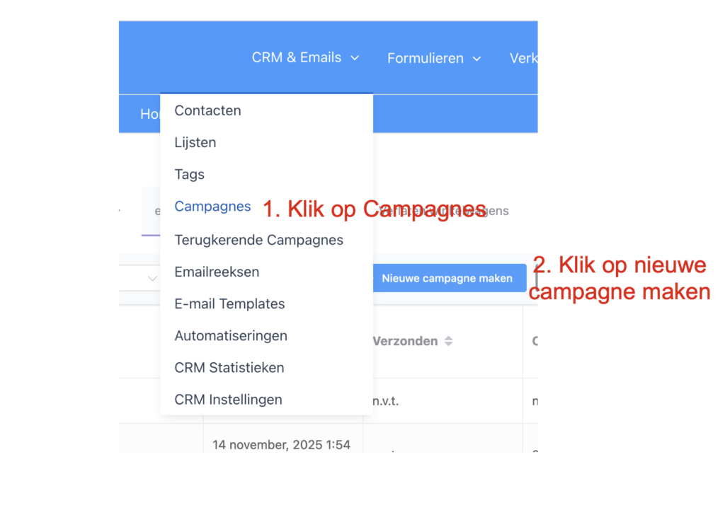 Nadat je segmenten hebt aangemaakt, kun je deze gebruiken bij het versturen van e-mailcampagnes. Ga naar CRM & Emails → Campagnes → ‘Nieuwe campagne’ , doorloop de stappen en selecteer bij ‘Ontvangers’ je opgeslagen segment.