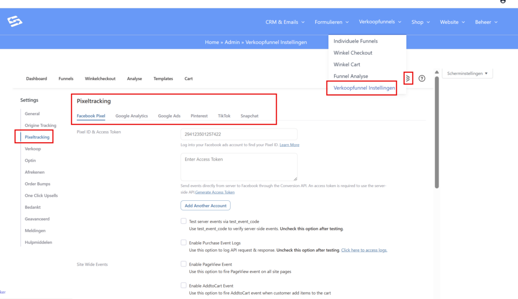 Als je gebruik maakt van Google Analytics, Google Ads of Facebook pixel dan kun je conversies gemakkelijk meten in de Verkoopfunnel instellingen.