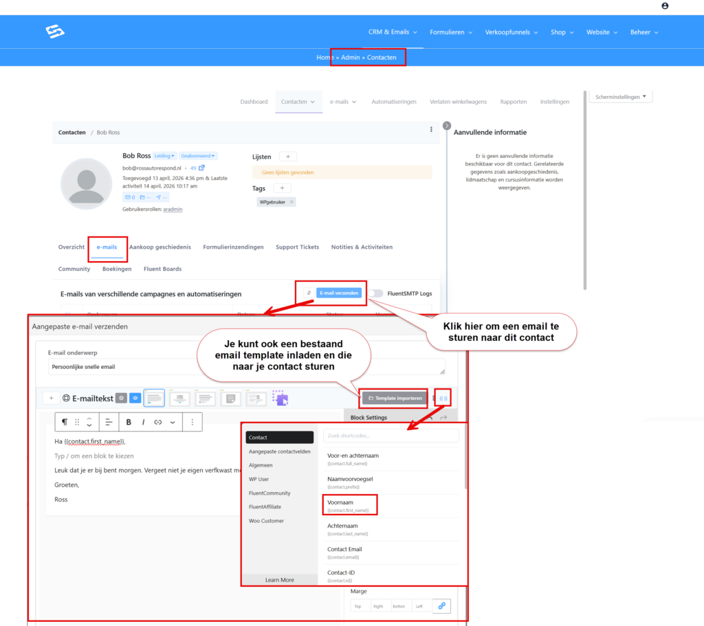Vul het onderwerp en de e-mailinhoud in, en klik op ‘Nu verzenden’ om de e-mail direct te versturen naar dit contact.