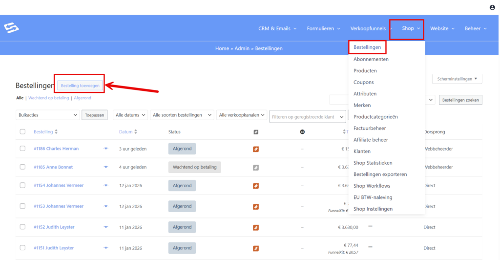 Wil je handmatig een bestelling aanmaken in Woocommerce? Ga naar menu Shop > Bestellingen en klik op ‘Bestelling toevoegen’: