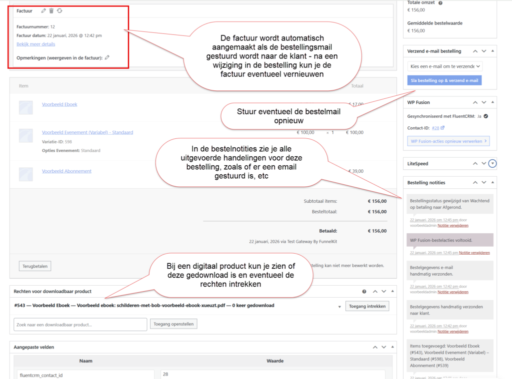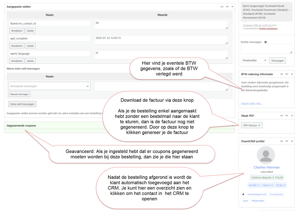 Na alles naar wens te hebben ingesteld kun je rechtsboven de bestelling aanmaken. Als je de bestelgegevens, factuur en betaallink wilt sturen naar de klant, kies dan ‘stuur bestelgegevens naar klant’.