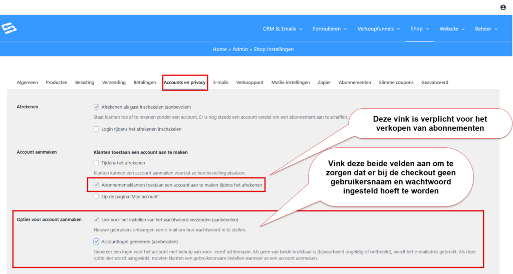 - Zorg dat ‘Abonnementsklanten toestaan een account aan te maken tijdens het afrekenen’ is ingeschakeld (accounts zijn verplicht voor abonnementen)