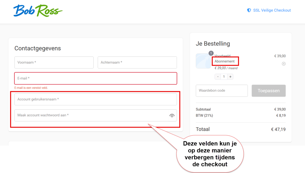 - Optionele gebruikersnaam veld bij checkout: Tijdens de checkout bij de aankoop van een abonnement kan je een veld laten zien of verbergen voor het aanmaken van ene gebruikersaccount en wachtwoord. De klant hoeft dus geen gebruikersnaam of wachtwoord in te vullen als je dat niet wilt.