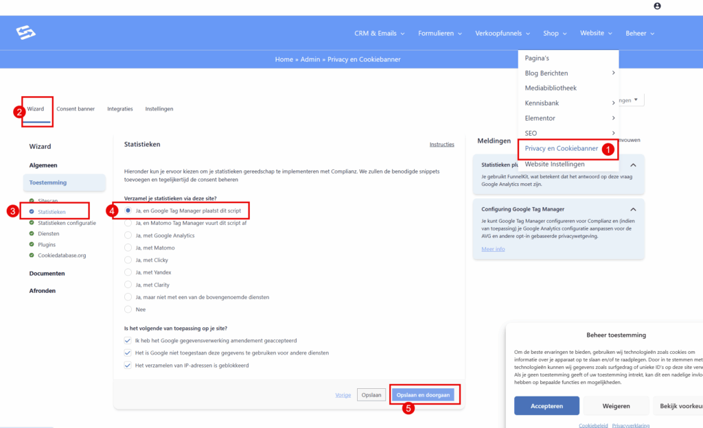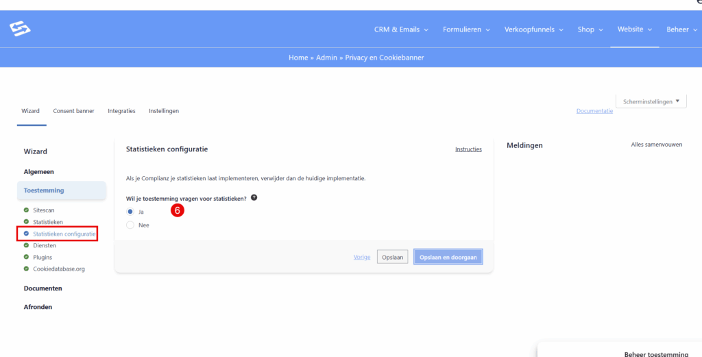 - Selecteer “Ja” (6) bij de vraag of je toestemming wilt vragen voor statistieken. Dit is een vereiste voor een AVG-proof inrichting.