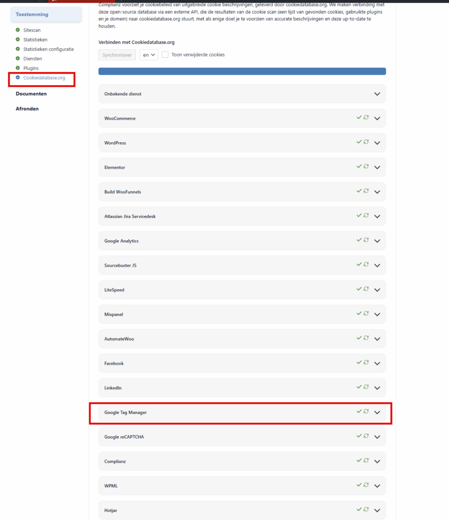 - Zorg dat de verbinding wordt gemaakt. In de lijst met gevonden diensten zul je nu ook Google Tag Manager zien staan. Dit zorgt ervoor dat de juiste beschrijvingen in je cookiebanner verschijnen.