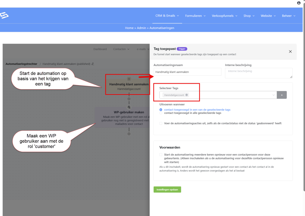 2. Ga naar menu CRM > Automations en maak een nieuwe Automation aan met als start trigger het krijgen van deze tag en als vervolgstap het aanmaken van een WP gebruikersaccount: