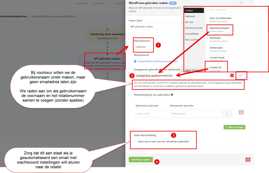 Let op: gebruik geen spaties in de gebruikersnaam. Best practice om voor iedere gebruiker een unieke gebruikersnaam te krijgen is om de voornaam te nemen en het contact ID, dus: {{contact.first_name}}{{contact.id}}