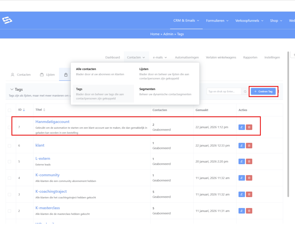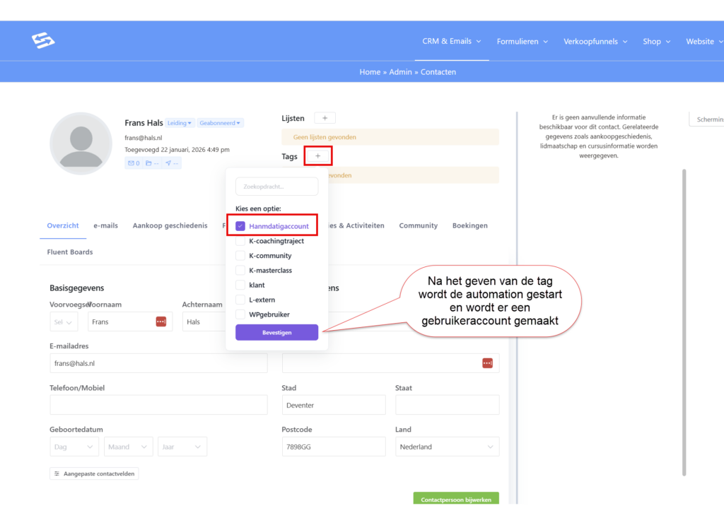 3. Nadat je deze automation hebt gemaakt kun je nu altijd snel handmatig een klant aanmaken vanuit het CRM. Je hoeft enkel de tag te geven aan het gewenste contact: