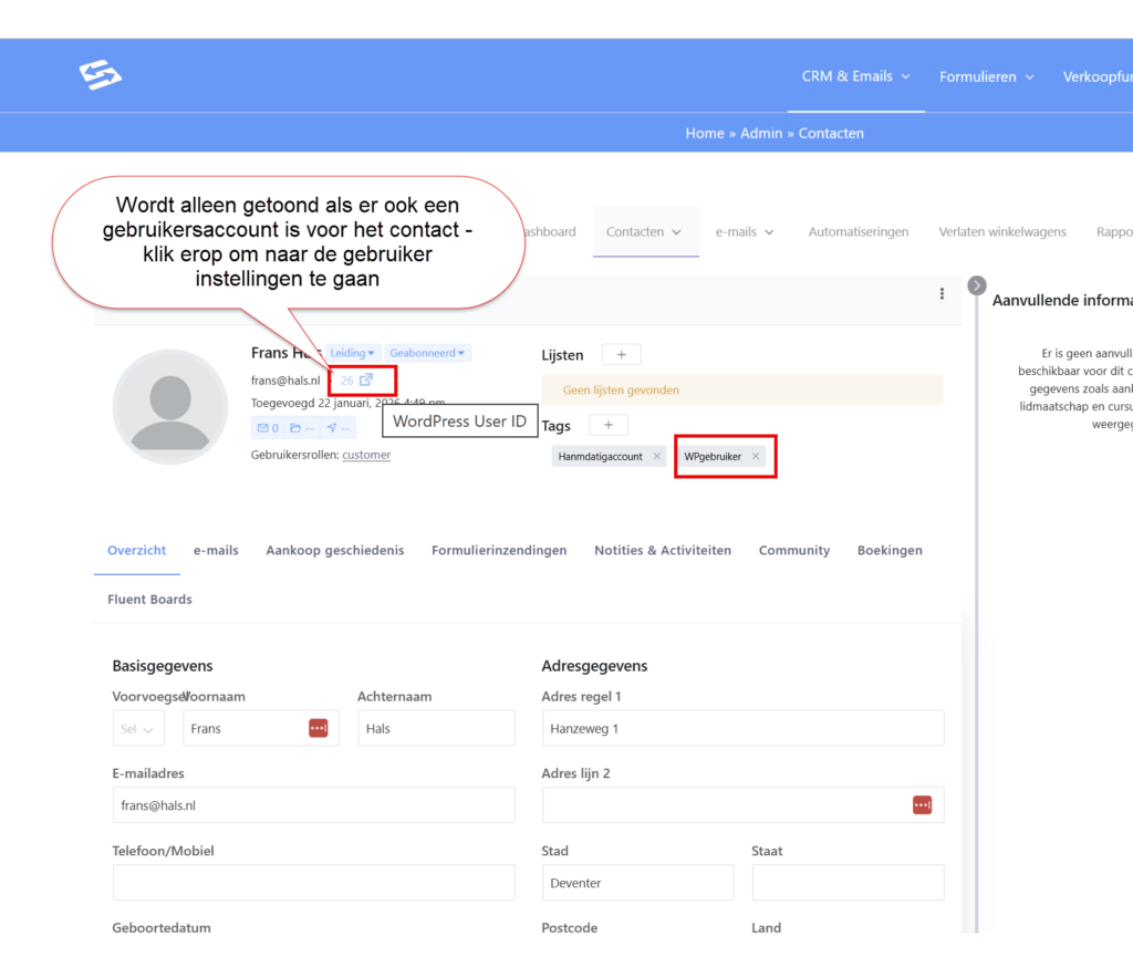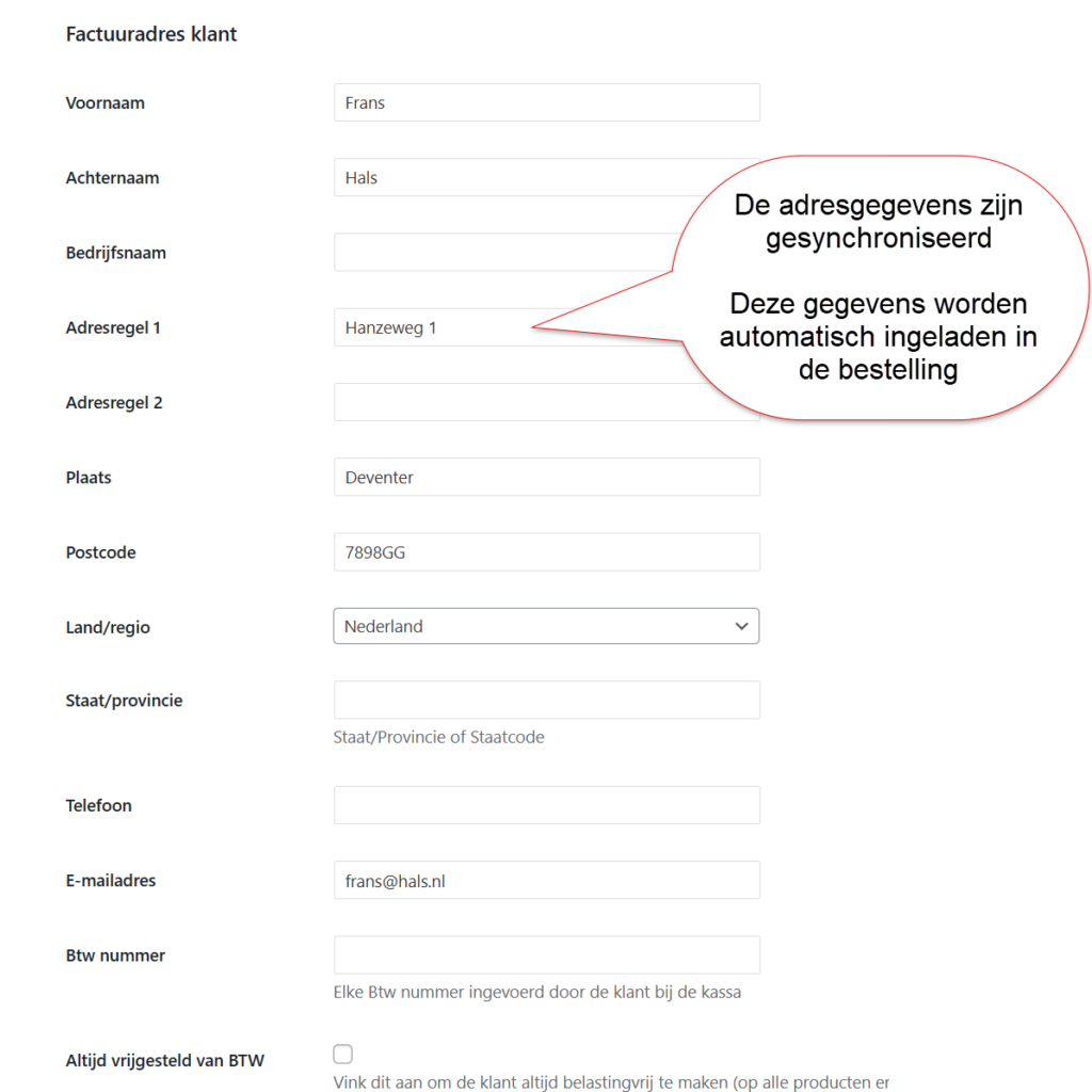 Als je naar onderen scrolt bij de gebruiker, dan zie je dat de adresgegevens ook gesynchroniseerd zijn met het CRM: