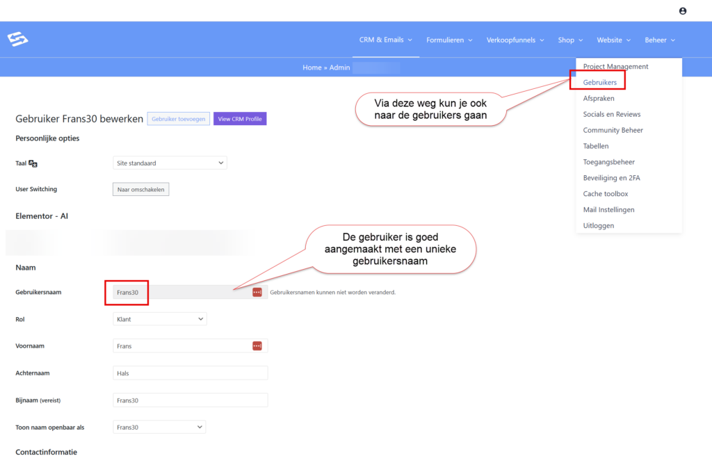 Via menu Beheer > Gebruikers kun je ook alle gebruikers zien. Daar kun je controleren of de gebruiker goed is aangemaakt: