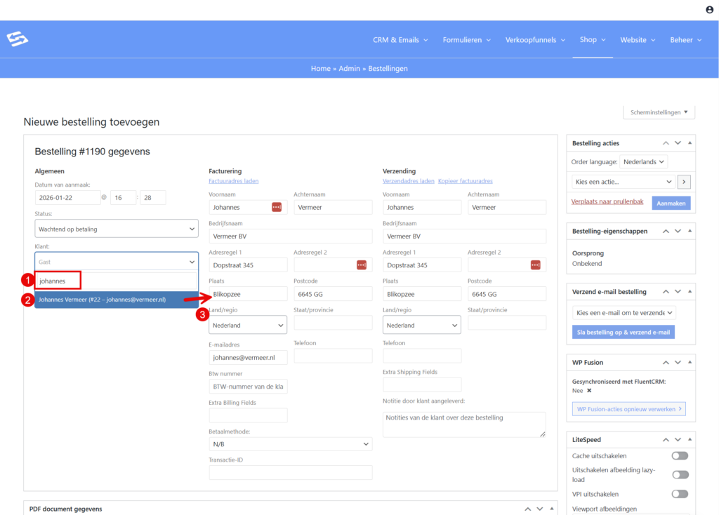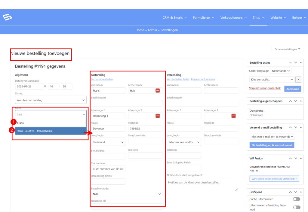 Maak hiervoor via menu CRM > Tags een speciale tag die je bijvoorbeeld ‘handmatig-account’ noemt en maaak dan eenmalig een automation via menu CRM > Automations aan met als startstap die tag en als vervolg stap ‘WP gebruiker aanmaken’ en als rol ‘customer’. Iedere contact die je vanaf dan deze tag geeft wordt automatisch als klant toegevoegd met de adresgegevens die bekend zijn in het CRM. Die klant kun je vanaf dan ook inladen in een bestelling.