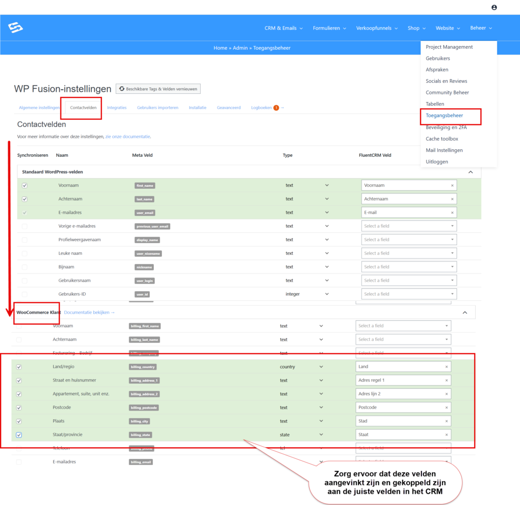Belangrijk: controleer via menu Beheer > Toegangsbeheer of de velden van Woocommerce gekoppeld zijn aan de velden van het CRM. Dit staat standaard zo ingesteld, maar als je hier in iets hebt gewijzigd dan zullen de CRM adres-gegevens niet goed gesynchroniseerd worden naar de woocommerce adresvelden