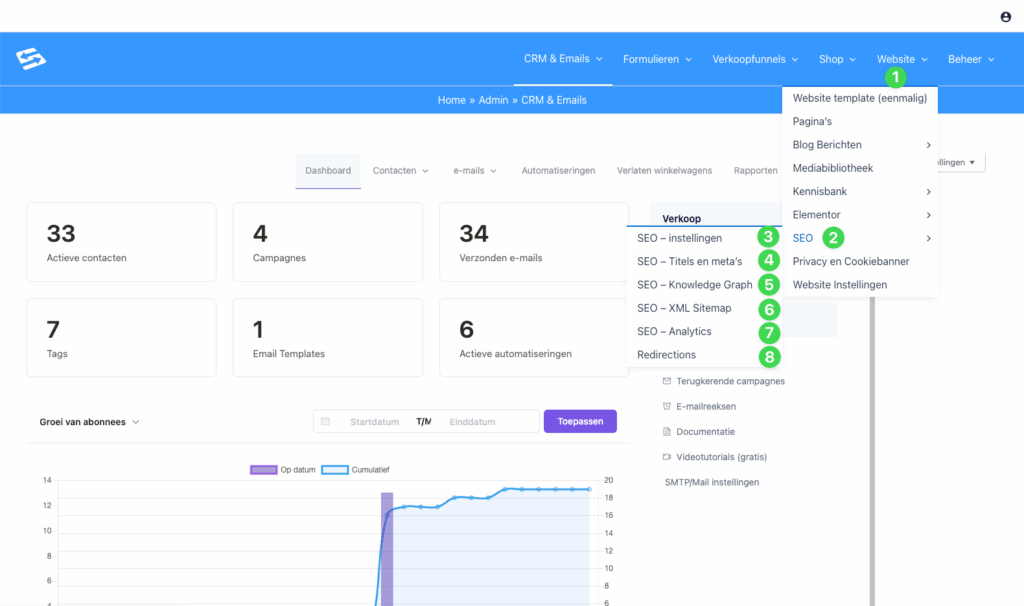Alle instellingen voor zoekmachineoptimalisatie zijn gecentraliseerd onder het kopje ‘Website’ in je hoofdmenu.