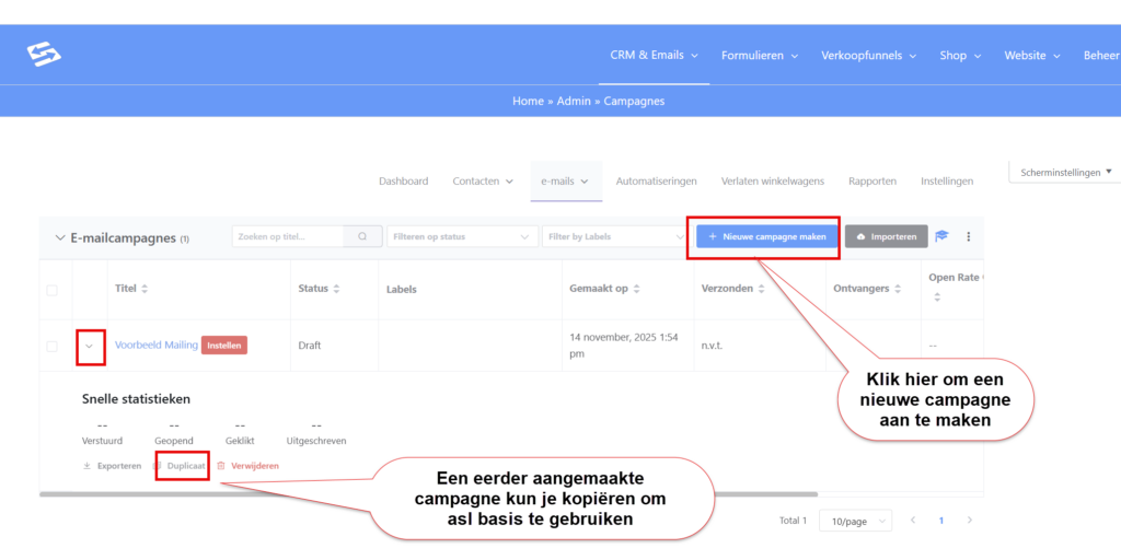 - Controleer de statistieken na verzending via CRM & Emails → Campagnes en klik bij de campagne op het pijltje naar beneden en dan statistieken.