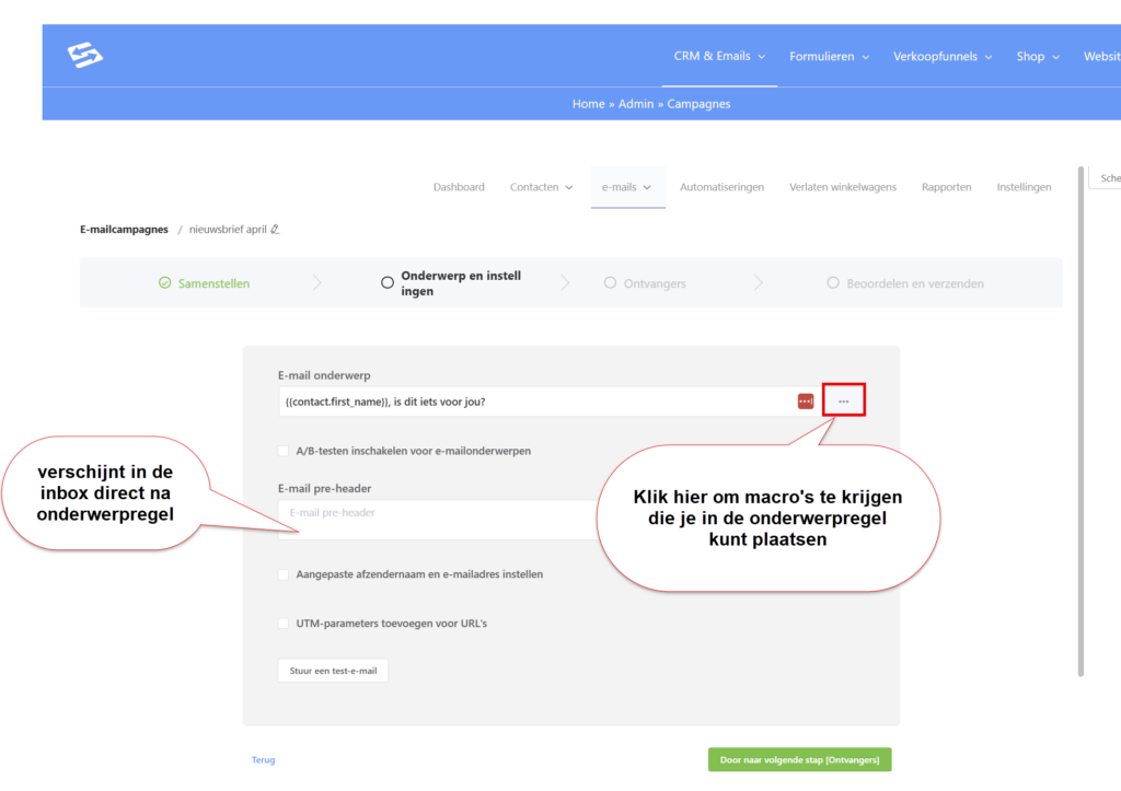 - ga dan door naar de volgende stap ‘onderwerp en instellingen’ en stel de onderwerpregel in