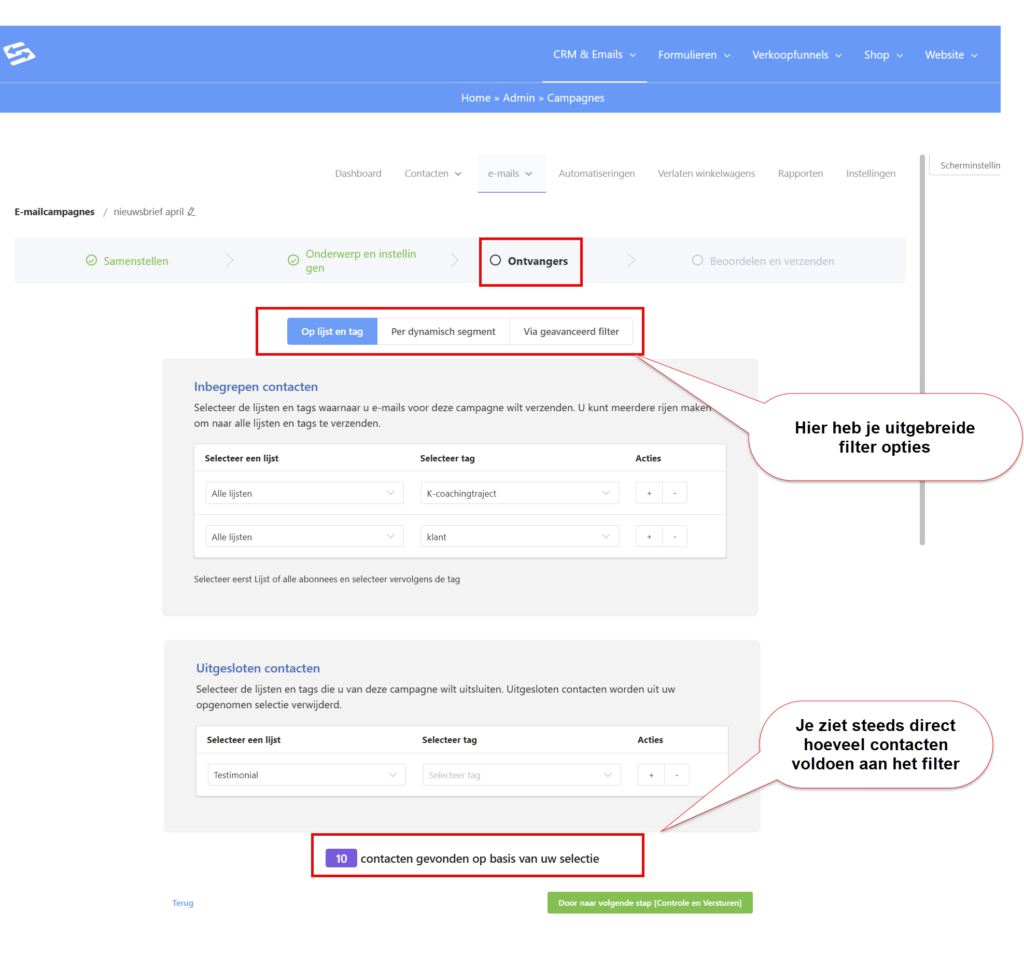 - In de volgende stap Selecteer je ontvangers (lijst, tag of segment)