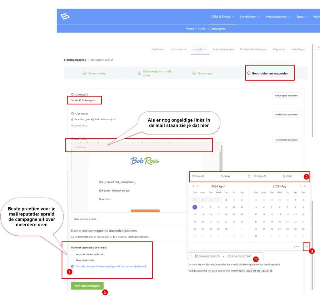 - In de volgende stap controleer je of alles goed staat en plan je de campagne in (best practice: spreid de campahgne uit over meerdere uren)