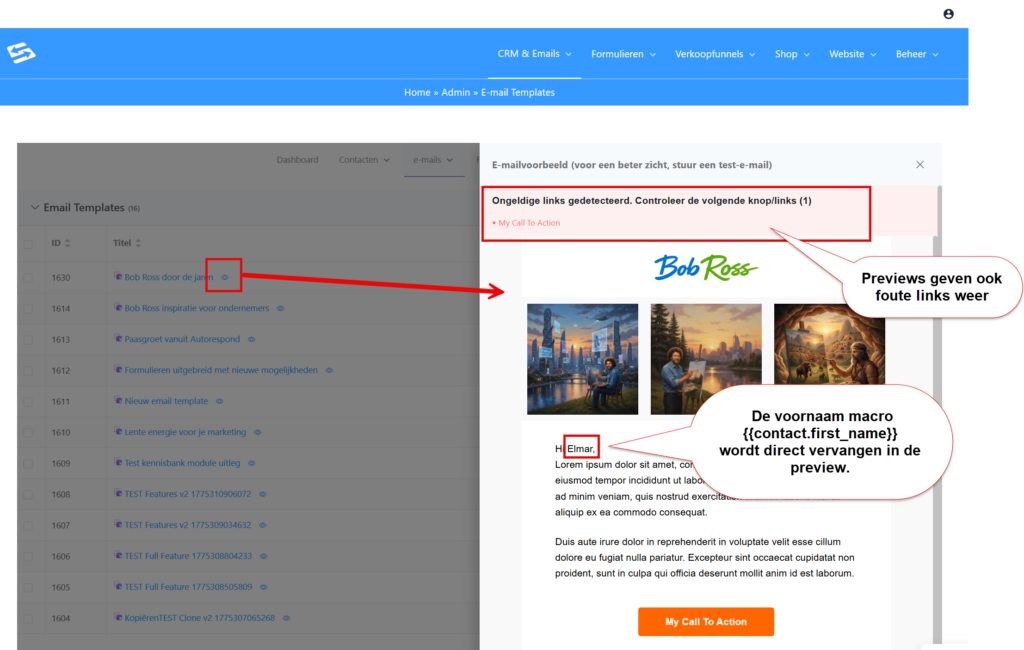 In de preview zie je precies hoe de e-mail eruitziet, inclusief hoe smartcodes worden ingevuld met voorbeeldgegevens. Ook zie je een waarschuwing als er foute links in de email staan: