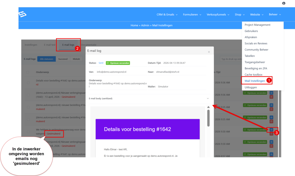 In de inwerker omgeving staan alle e-mails uit als beveiligingsmaatregel. Dit voorkomt dat er onbedoeld e-mails worden verstuurd tijdens het testen. Gebruik de preview-functie of bekijk gesimuleerde e-mails in de mail logs.