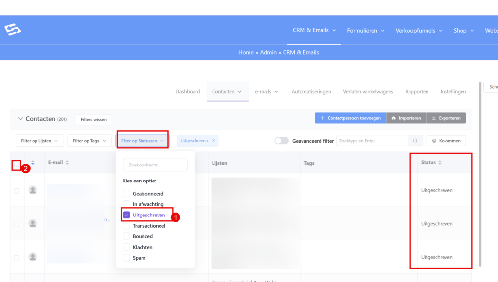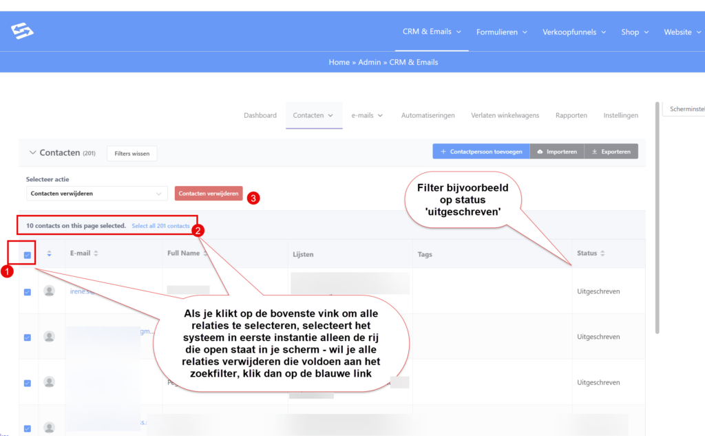 Als je bijvoorbeeld alle relaties die zich hebben uitgeschreven in één keer wilt verwijderen, dan filter je op status ‘uitgeschreven’: