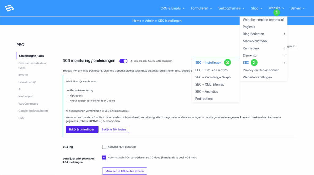 Tip: Zet de schakelaar bij ‘404 monitoring’ aan om inzicht te krijgen in gebroken links op je site.