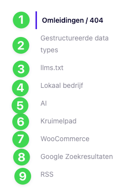 6. Kruimelpad (Breadcrumbs) Een kruimelpad helpt bezoekers navigeren (bijv. Home > Blog > Artikel). Hier stel je in hoe dit pad eruitziet en of zoekmachines dit pad ook in de zoekresultaten moeten tonen.
